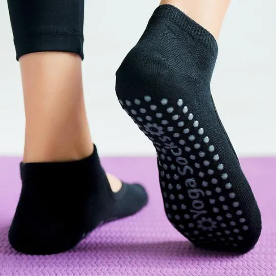 Made of rubber-like dots or patterns on the soles, which serve to create a slip-free surface while you move or pose